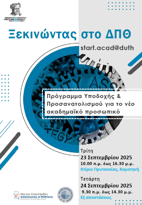 The first cycle of the Induction & Orientation Programme for new academic staff | START.ACAD @DUTH, organised by the Quality Assurance Unit of Democritus University of Thrace and the University’s Centre of Teaching and Learning, will take place on 23 and 24 September 2025. The programme will cover key aspects of academic work, including teaching organisation, research project management, mobility opportunities, quality assurance, internationalisation, gender equality, accessibility, and more.