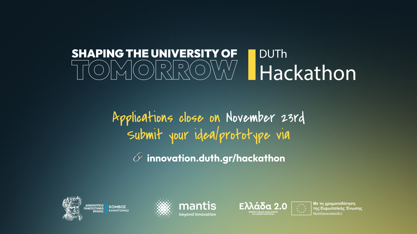 Democritus University of Thrace and Mantis Beyond Innovation join forces to organize the DUTh Hackathon, a new initiative by DUTh Innovation Hub, inviting student and research teams, faculty members, and administrative staff to shape the University of Tomorrow.