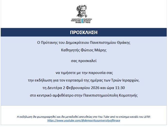 Το Δημοκρίτειο Πανεπιστήμιο Θράκης θα πραγματοποιήσει την εκδήλωση για τον εορτασμό της ημέρας των Τριών Ιεραρχών, τη Δευτέρα 2 Φεβρουαρίου